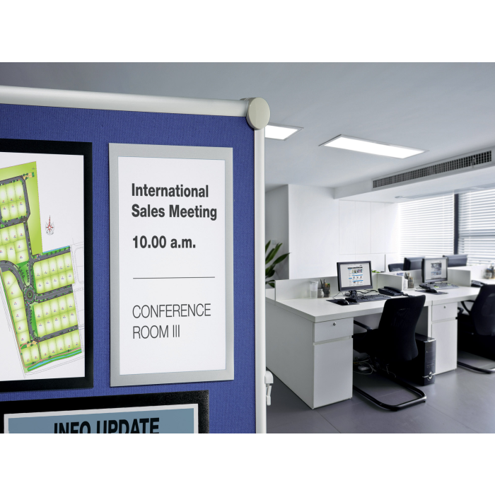 Informačný panel použiteľný iba na textilné povrchy, ako napr. textilné a moderačné tabule. Jednoduché a rýchle vkladanie informácie formátu A4. Na zadnej strane špeciálny priľnavý povrch, ktorý pri premiestňovaní panelu nepoškodzuje textilný povrch tabule. Farba čierna. Balenie 1 ks.