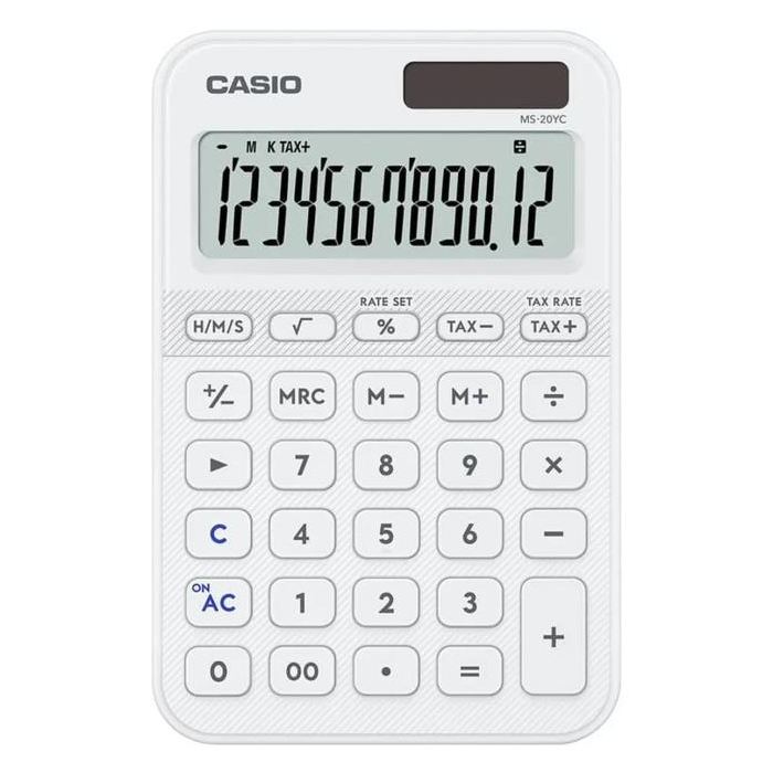 Stolová kalkulačka Casio MS 20 YC WE biela veľký 12-miestny LCD displej výpočet DPH výpočet marže s tlačidlom percent výpočty s časom 3-tlačidlová pamäť solárne/batériové napájanie rozmery 101 × 154,5 × 18 mm hmotnosť 118 g