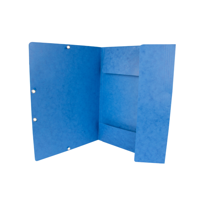 Obal s tromi chlopňami a gumičkou z kvalitného hladkého kartónu gramáže 375 g. Chrbtový štítok, kapacita 200 listov. Farba modrá.