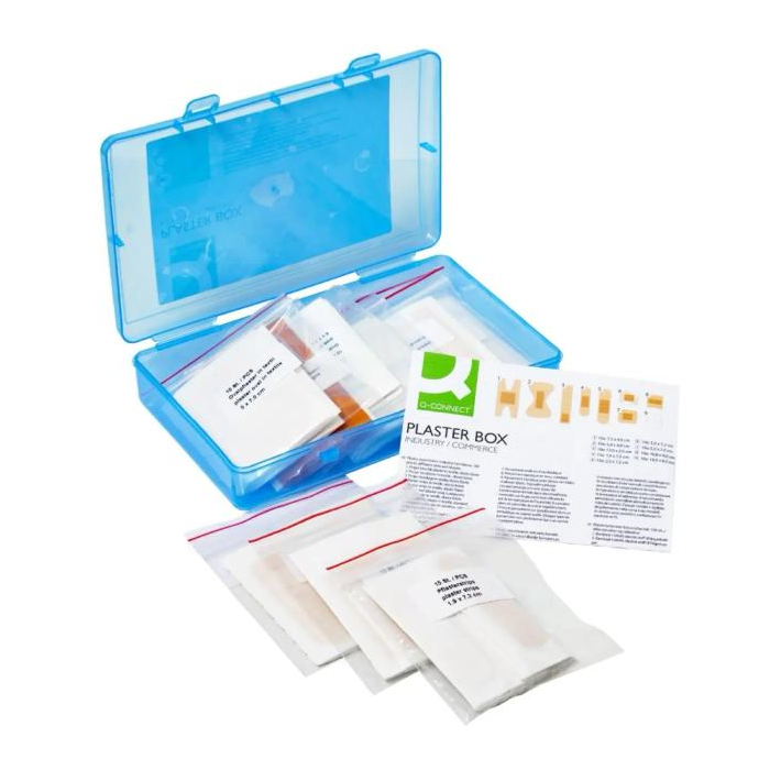 Ideálne na drobné poranenia v reštauráciách a obchodných prevádzkach. Praktická, uzatvárateľná plastová krabička. Obsah: - 10 bandáží na kĺby prstov (7,5 x 4 cm) z textilnej elastickej látky. - 10 obväzov na končeky prstov (5 x 4 cm) z textilnej elastickej látky. - 10 obväzov na prsty (12 x 2 cm) z textilnej, elastickej látky. - 15 malých sadrových pásikov (1,9 x 7,2 cm) z textilnej elastickej látky. - 15 sadrových pásikov (2,5 x 7,2 cm) z textilnej, elastickej tkaniny. - 10 vodotesných oválnych náplastí (5,0 x 7,2 cm) transparentných. - 10 oválnych náplastí (5 x 7 cm) z textilnej, elastickej tkaniny. - 10 obväzov na rany (10 x 6 cm) z textilu, štandard. - 10 citlivých obväzov na rany (10 x 6 cm), biele fleece, hypoalergénne. Rozmer (ŠxVxH): 20,8 x 4,4 x 13,2 cm. Hmotnosť: 226 g. Farba: modro-transparentná