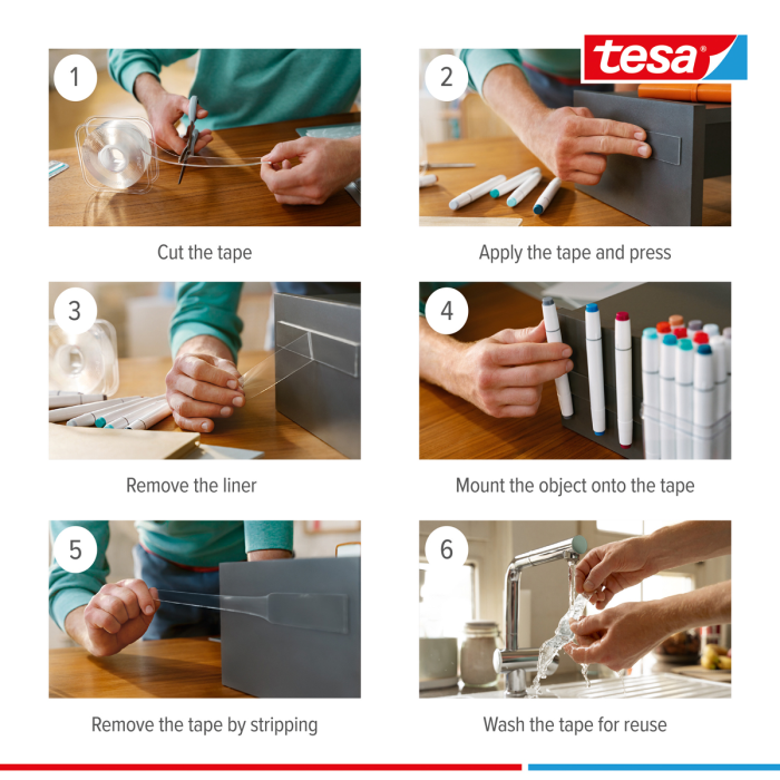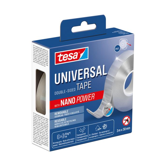 tesa® Univerzálna Nanotape môže byť uložená v akejkoľvek zásuvke alebo náradí a je ľahko dostupná, či už na ceste v aute alebo karavane. Obojstranná páska ponúka veľkú lepiacu silu a môže odolať vysokým zaťaženiam, aj po dlhú dobu. Môže byť odstránená úplne bez zvyškov z hladkých a pevných povrchov, umytá a potom opakovane použitá. Praktický dávkovač tiež umožňuje jednoduché a časovo úsporné odvíjanie.