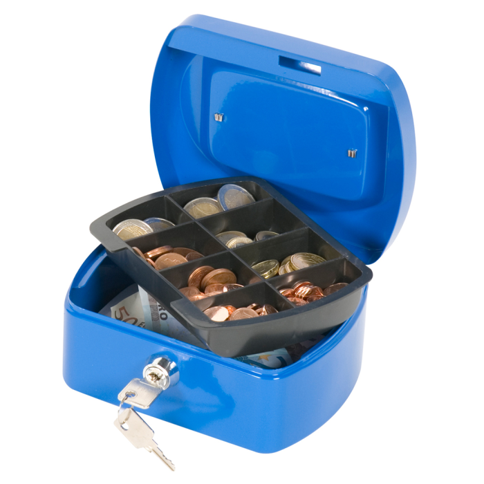 Uzamykateľná pokladnička s tvarovaným úchytom, plastovou priehradkou na mince a 2 kľúčami. Materiál pevná oceľ. Rozmery 155 × 75 × 120 mm. Farba modrá.