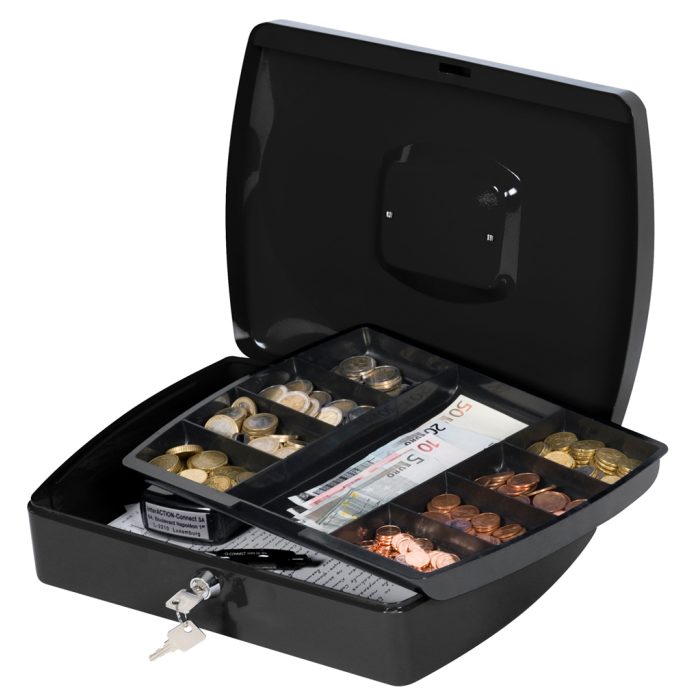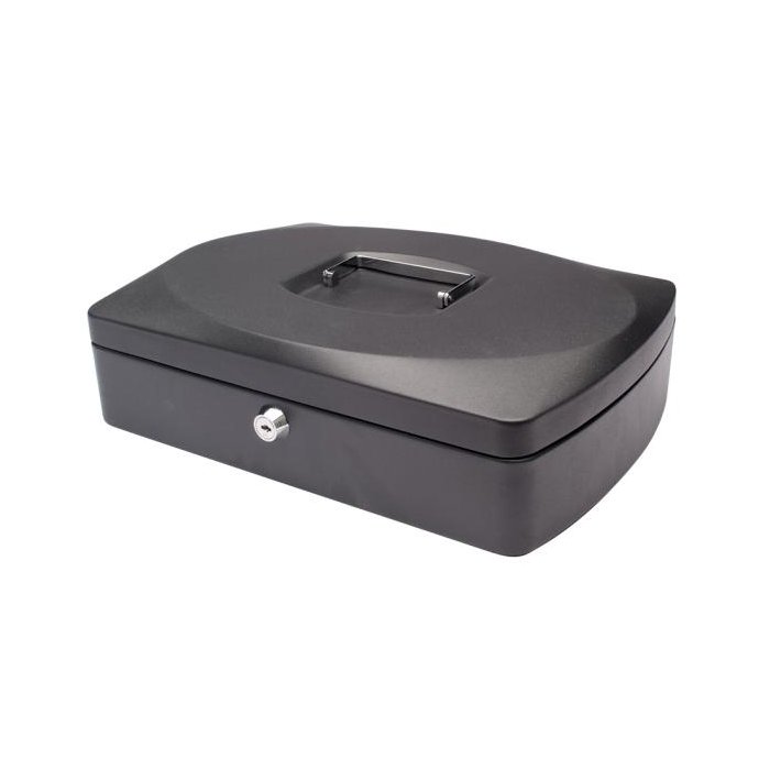 Uzamykateľná pokladnička s tvarovaným úchytom, plastovou priehradkou na mince a 2 kľúčami. Materiál pevná oceľ. Rozmery