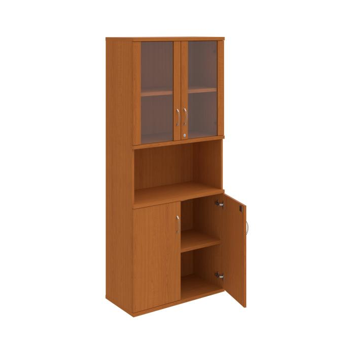 Kombinovaná skriňa - dvere/nika. Kancelárske skrine STRONG majú robustnú konštrukciu a vyššiu nosnosť políc ako bežné kancelárske skrine.V ponuke sú skriňové moduly s výškou 185 cm, 111 cm alebo 74 cm a šírky 80 cm alebo 40 cm. Hĺbka všetkých modelov skriňového radu STRONG je 40 cm.Chrbát, vyrobený z 8 mm hrubých dosák, je obojstranne pohľadový, takže skrine môžete použiť ako priestorový deliaci prvok. Hrúbka samotných políc je 25 mm, čo znamená nosnosť 80 kg na 1 policu.Korpusy, dvierka a police skríň sú olepené odolnou 2mm ABS hranou, ktorá garantuje dostatočnú ochranu proti poškodeniu.