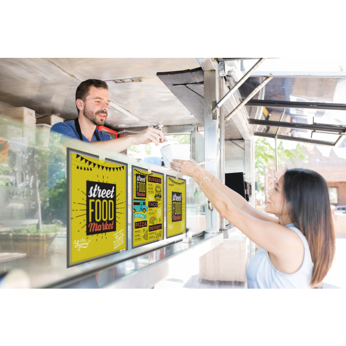 Držiak na dokumenty vo formáte A4 na pripevnenie pomocou troch lepiacich pásikov. Výrez na vkladanie a vyberanie dokumentov.
