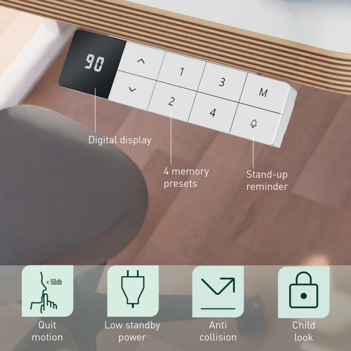 • Ovládací panel s detskou poistkou, nabíjacími portmi USB-C a USB-A, digitálnym displejom výšky, dôvtipnými pripomenutiami vstávania, ochranou proti prehriatiu a funkciou proti kolízii.