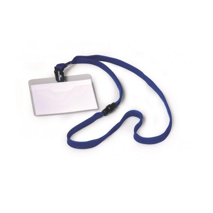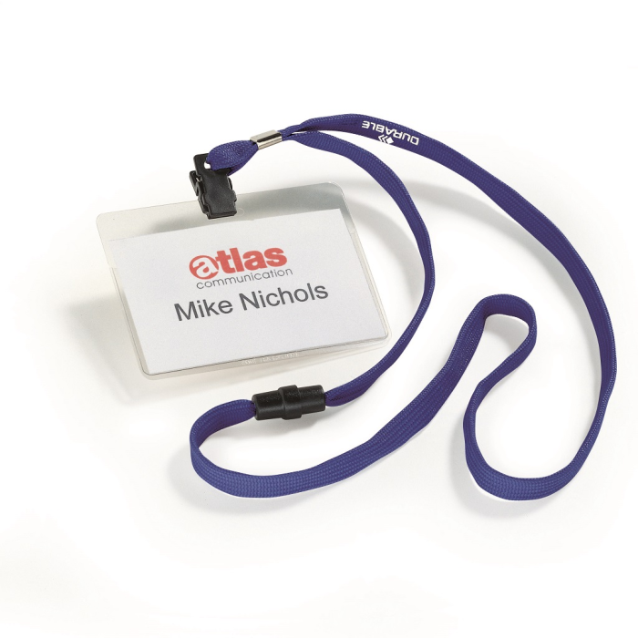 Visačka na krk s farebným bezpečnostným remienkom dĺžky 44 cm. Poistka na remienku sa uvoľní pri zachytení remienka alebo silnom potiahnutí. Materiál pevné priehľadné PVC, závesný remienok šírky 10 mm. Balenie 10 ks. Náhradné papieriky DU145602.