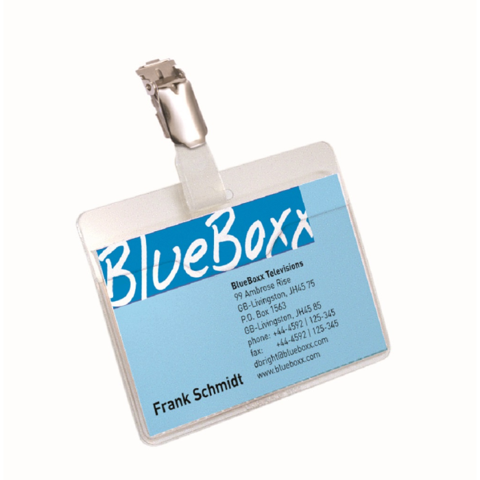 Priehľadná visačka s európskym štipcom, umiestneným na dlhšej strane visačky. Dodávané s papierovými kartičkami rozmerov 90 × 60 mm. Model, pri ktorom možno menovku vyberať bez potreby odnímania štipca s remienkom. Farba transparentná. Balenie 5 ks.