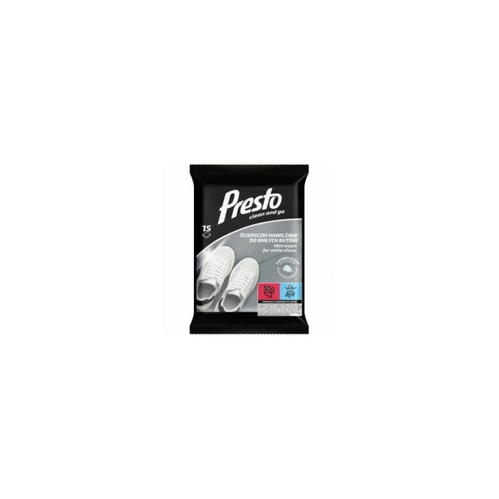 PRESTO CLEAN - VLHČENÉ OBRÚSKY NA BIELU OBUV 15 KS. Presto Clean vlhčené utierky na biele topánky sú praktickým riešením na rýchle a efektívne čistenie a ošetrovanie bielych topánok, ktoré sú náchylné na špinu a škvrny. Tieto špeciálne navrhnuté utierky okamžite odstraňujú nečistoty, prach a škvrny z povrchu topánok, čím udržiavajú ich pôvodnú belosť a čistý vzhľad. Vďaka svojmu zloženiu Presto Clean utierky šetrne čistia rôzne materiály, vrátane kože, syntetických materiálov a textílií, bez toho, aby zanechávali škvrny alebo stopy. Sú ideálnym pomocníkom na rýchle čistenie v teréne alebo doma, a zároveň zanechávajú topánky svieže a žiarivé. Ich kompaktné balenie je vhodné na cesty, takže si môžete svoje biele topánky udržiavať čisté kdekoľvek a kedykoľvek. Hlavné vlastnosti: Efektívne odstraňujú prach, špinu a škvrny. Vhodné na biele kožené, syntetické a textilné topánky. Nezanechávajú šmuhy ani stopy Jednoduché použitie - ideálne na cesty alebo rýchle čistenie.